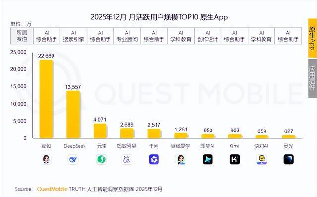 QuestMobile最新发布的2025年12月AI原生App月活数据显示,豆包以22669万的月活跃用户规模稳居行业第一。